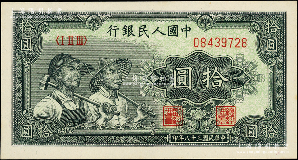 第一版人民币“工农图”拾圆,源于前辈名家之遗藏,全新