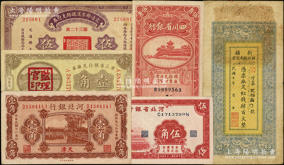 民国纸币6种,详分:交通部京汉铁路支付券1922年伍圆;东三省银行兑换券1923年壹角,盖“监理官印”;河北银行1929年天津壹角;河北省银行1940年伍角;四川省银行1936年伍角;新疆财政厅库官票1921年红钱肆百文;源于前辈名家之遗藏,七至九成新