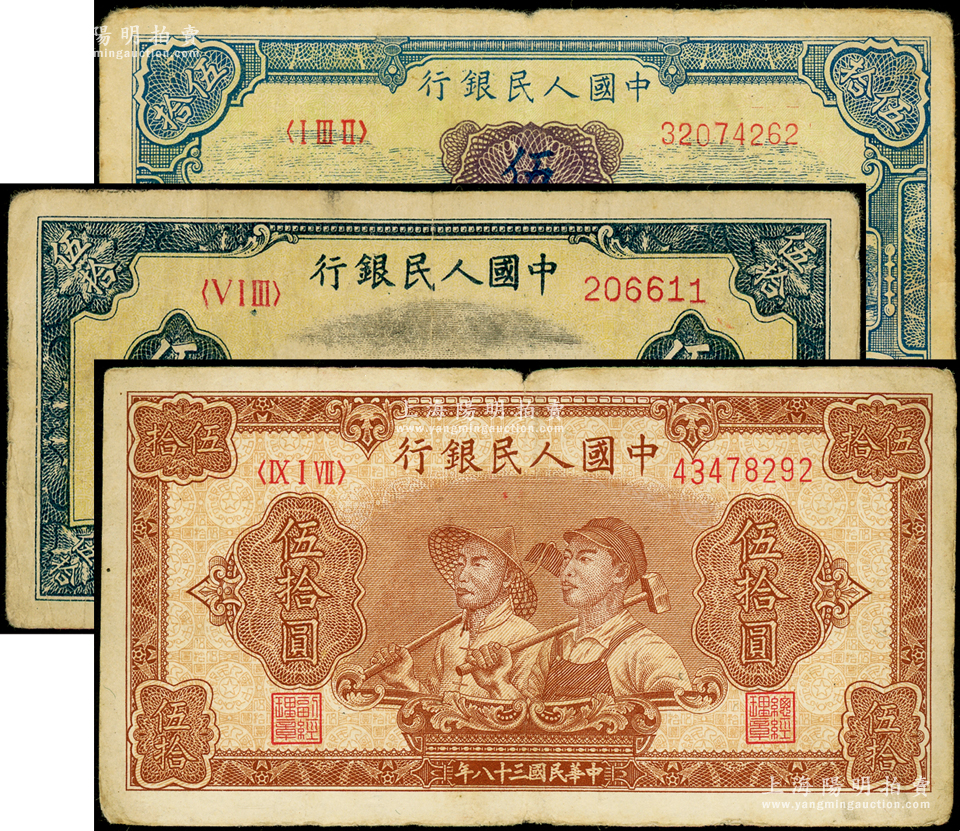 第一版人民币“蓝色火车大桥”伍拾圆、“铁路”伍拾圆6位号、“工农图”伍拾圆共3枚不同,原票七至七五成新