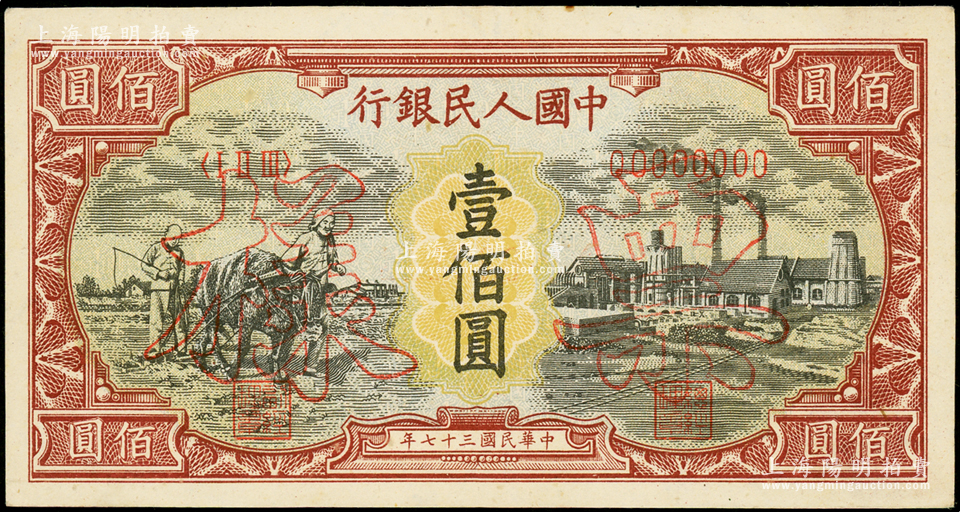 第一版人民币“耕地与工厂”壹佰圆票样,正背面合印,内有水印;俄国藏家出品,未折九五成新