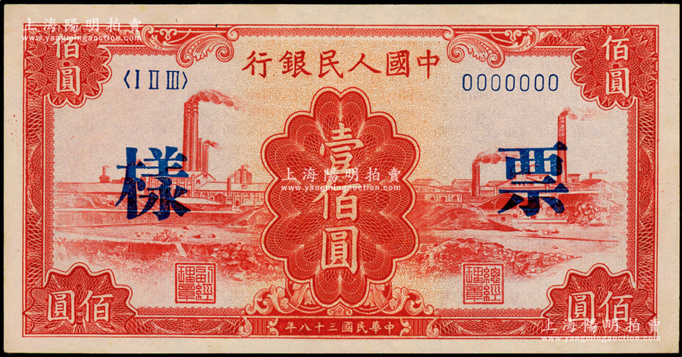 第一版人民币“红工厂”壹佰圆票样,正背面合印,俄国藏家出品,未折九五成新
