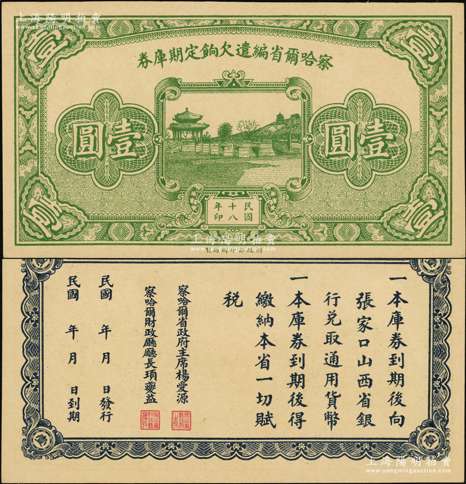 民国十八年(1929年)察哈尔省编遣欠饷定期库券壹圆,发行于中原大战前夕;源于前辈名家之遗藏,九八成新