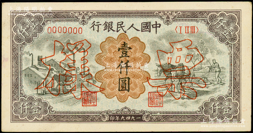 第一版人民币“推车与耕地”壹仟圆票样,正背共2枚(其票样号码与下一件连号),俄国藏家出品,九五成新