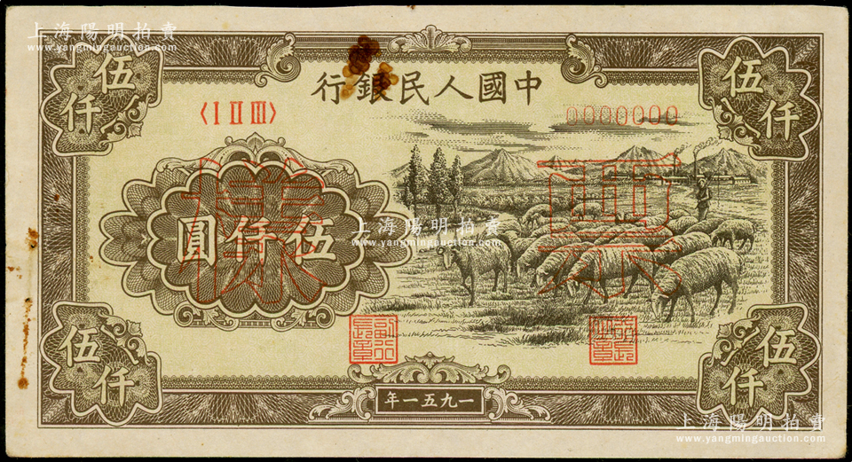 第一版人民币1951年维文版“绵羊图”伍仟圆票样,正背共2枚,少见,有锈斑,原票八五成新