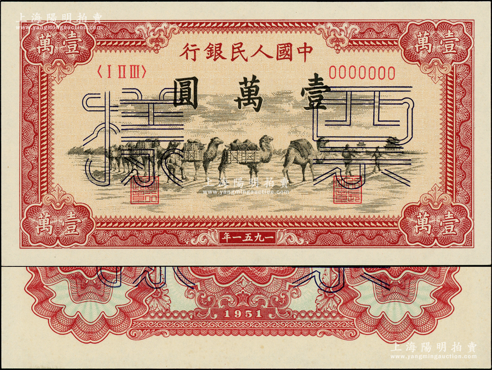 第一版人民币1951年维文版“骆驼队”壹万圆票样,正背共2枚,前辈藏家出品,原汁原味,全新绝品