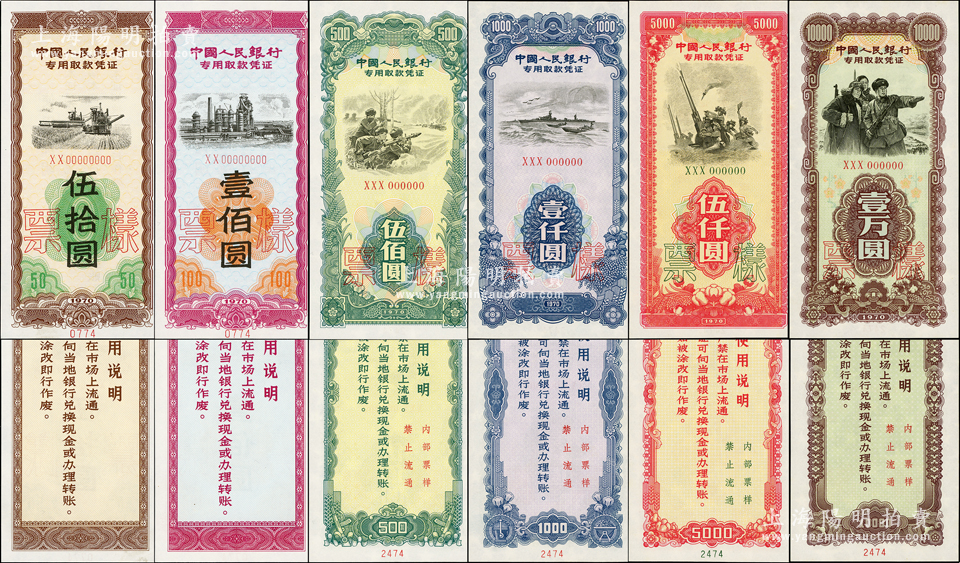 1970年中国人民银行专用取款凭证伍拾圆、壹佰圆、伍佰圆、壹仟圆、伍仟圆、壹万圆票样共6枚全套,分别上印收割机、炼油厂、珍宝岛战役、军舰、高射炮和军人图,其中4种大面额券有五星水印;背印“严禁在市场上流通,可向当地银行兑换现金”等使用说明;此套钞票未见图谱记载,诚可遇而不可求也,珍罕品,九八至全新