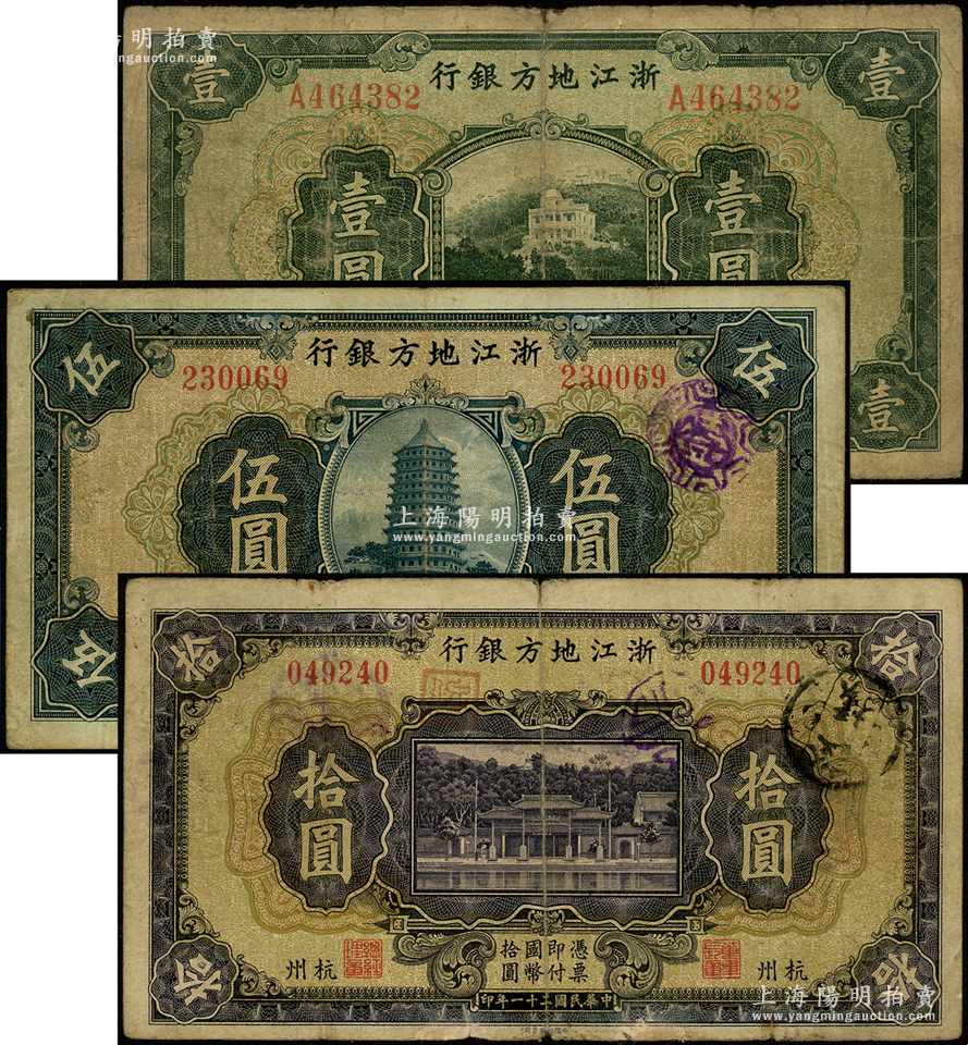民国二十一年(1932年)浙江地方银行壹圆、伍圆、拾圆共3枚全套,杭州地名,其中拾圆券存世颇为少见;源于前辈名家之遗藏,其中壹圆券背有老式贴痕,七至七五成新