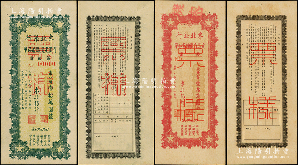 东北银行定期有奖储蓄存单1950年红色东北币壹拾万圆、1951年绿色东北币壹拾万圆票样共2枚不同,背印说明文字,少见,九至九五成新