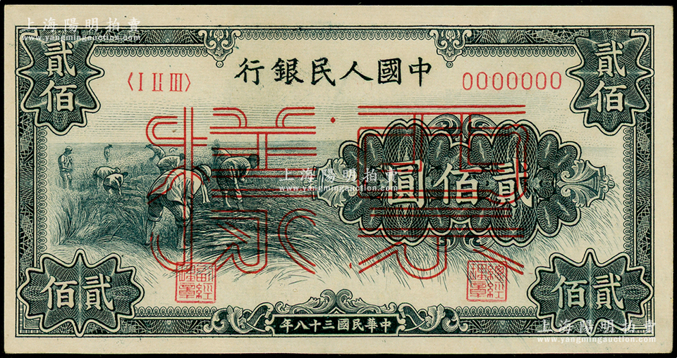 第一版人民币“割稻图”贰佰圆票样,正背共2枚,俄国藏家出品,未折九五成新