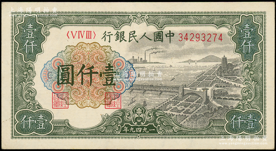 第一版人民币“钱江桥”壹仟圆,内有水印,源于前辈名家之遗藏,原票九成新
