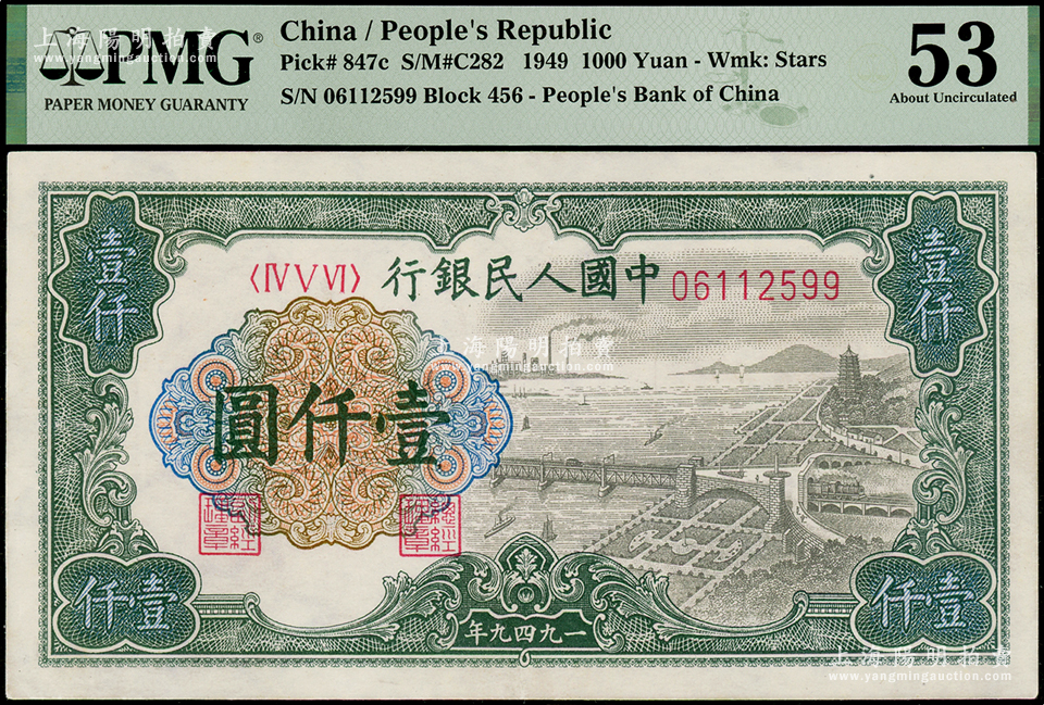 第一版人民币“钱江桥”壹仟圆,PMG 53 AU