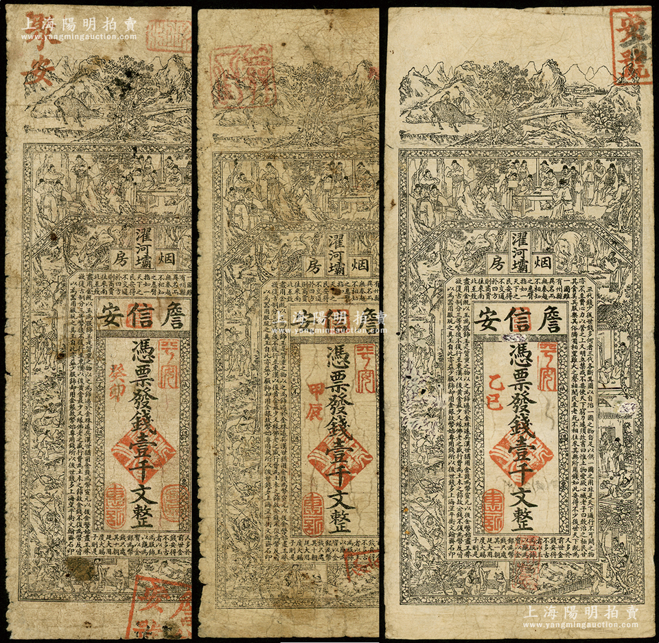 清代(濯河壩烟房)詹信安壹千文共3种全套,分别发行于癸卯(1903年)、甲辰(1904年)和乙巳(1905年),属四川黔江县钱庄钞票,上印山水风景、官宦、十孝图及《金钱歌》,由上海代印;成套者少见,六五至七成新