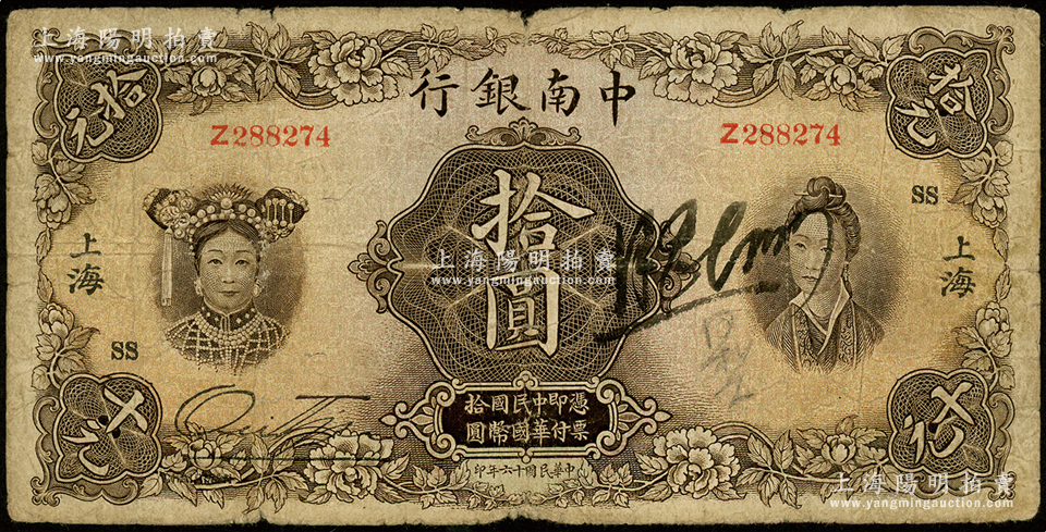民国十六年(1927年)中南银行五女图拾圆,上海地名,加印领券“SS”字样,原票七成新
