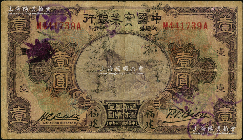 民国二十年(1931年)中国实业银行壹圆,福建地名;源于英国名家奥斯汀先生之旧藏,原票六成新