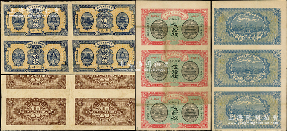 财政部平市官钱局联体铜元票共2版不同,详分:1915年伍拾枚3张联体、1923年京兆拾枚4张联体,其中1版有修补,七五至八成新