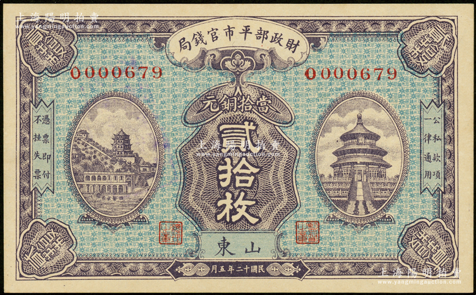 民国十二年五月(1923年)财政部平市官钱局当拾铜元贰拾枚,山东地名,背盖“济南平市官钱局发行章”;源于杭州集钞前辈朱德水先生之旧藏(背盖CTS收藏章),九八成新