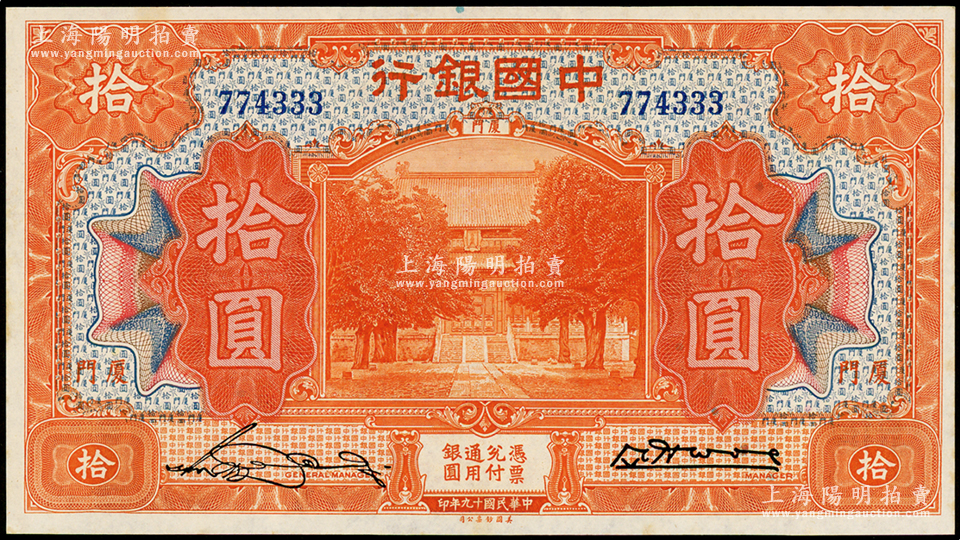 民国十九年(1930年)中国银行拾圆,厦门地名,张嘉璈·黄伯权签名,且尾号为333豹子号,原汁原味,九八成新