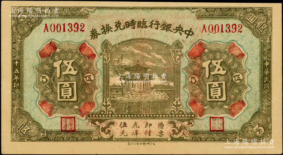民国十五年(1926年)中央银行临时兑换券伍圆,背印国民革命军总司令部蒋中正之告示,九成新