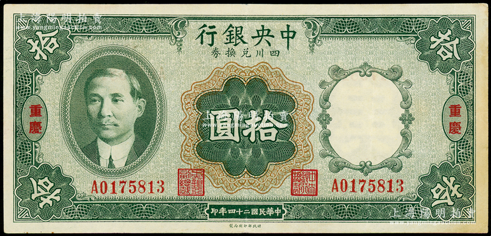 民国二十四年(1935年)中央银行四川兑换券拾圆,重庆地名,八五成新