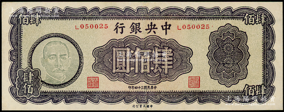 民国三十四年(1945年)中央银行大业版肆佰圆,俗称“木刻版”,近九成新