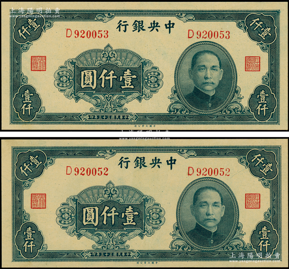 民国三十三年(1944年)中央银行大业版壹仟圆共2枚连号,单字轨,上佳品相,原汁原味,九八成新