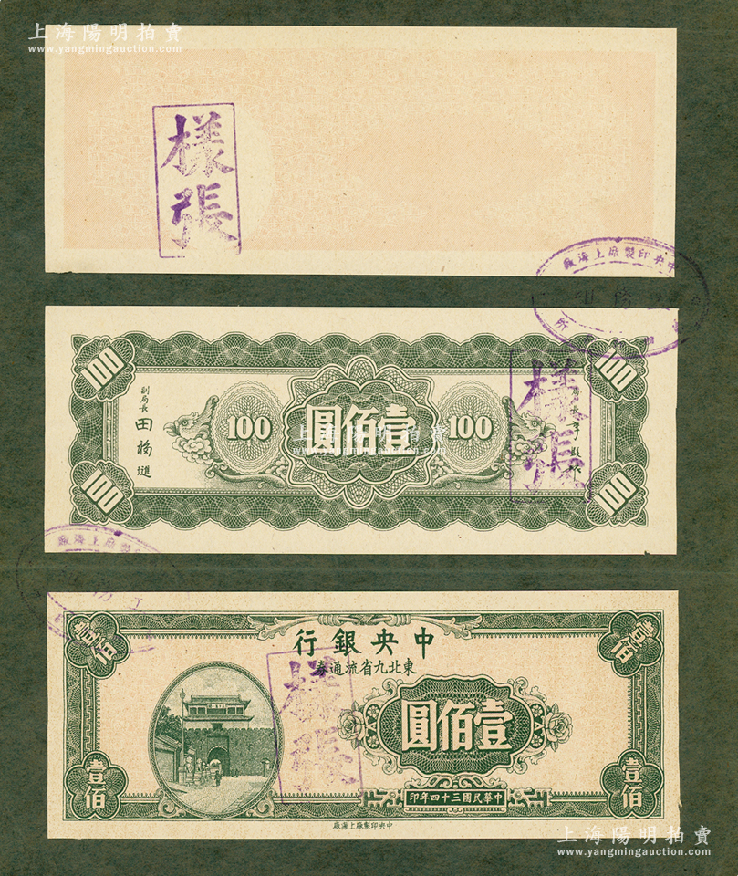民国三十四年(1945年)中央银行东北九省流通券壹佰圆样张共3枚全套,内含正背面及底纹样张各1枚,张贴档案卡纸之上,且骑缝处盖有“中央印制厂上海厂第四印刷所工务组”戳记,罕见,九八成新