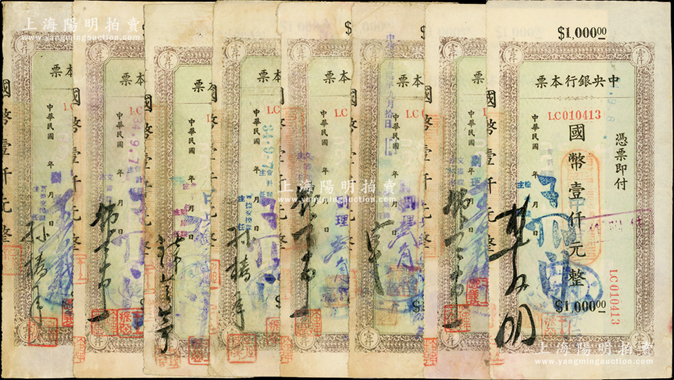民国34年(1945年)中央银行兰州分行本票(无印刷厂名版)国币壹仟圆共8种,其签名全部不同,其签名者职务涉及副理、文书课、检查课、国库科、票据交换课、会计科主任等,七五至八成新