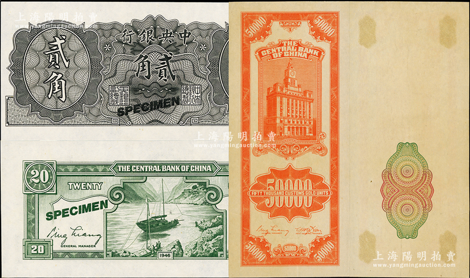 中央银行纸币2种,详分:1948年关金中央厂桔色伍万圆半成品券,正面仅印有底纹,背面则图案齐全;1946年金圆券德纳罗版贰角试色样本,正面黑色,背面绿色(注:流通票为桔色),九五至全新