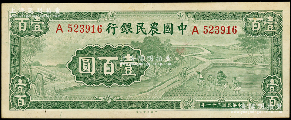 民国三十一年(1942年)中国农民银行大业版壹佰圆,单字轨,原票九成新