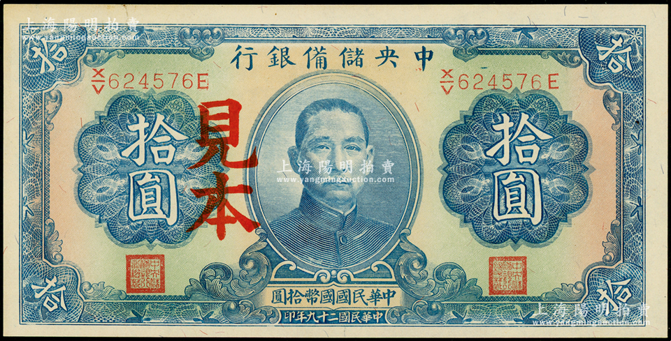 民国二十九年(1940年)中央储备银行第三版拾圆正票改作见本,单面号码蓝签名,原汁原味,九八成新