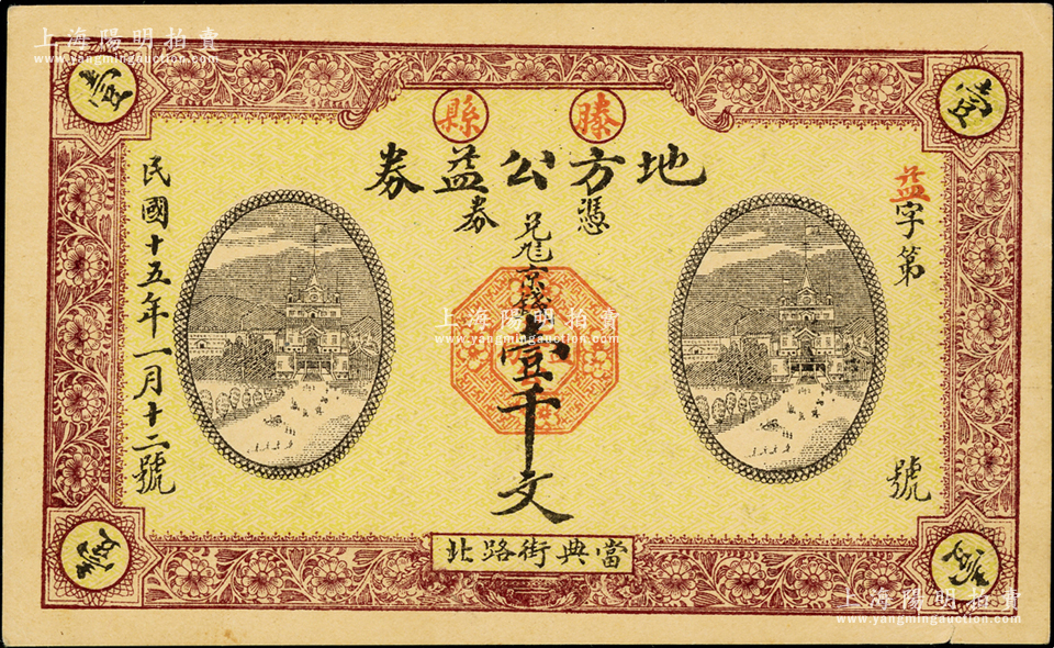 民国十五年(1926年)滕县地方公益券京钱壹千文,背印发行简章,且言明“以供军队需款浩繁”等情,由此可证此券当属北伐战争时张宗昌直鲁联军在滕县所发行,至1927年6月北伐军李宗仁部攻克滕县,其发行时间只有一年多;罕见且属首度公诸于阳明,未折九成新