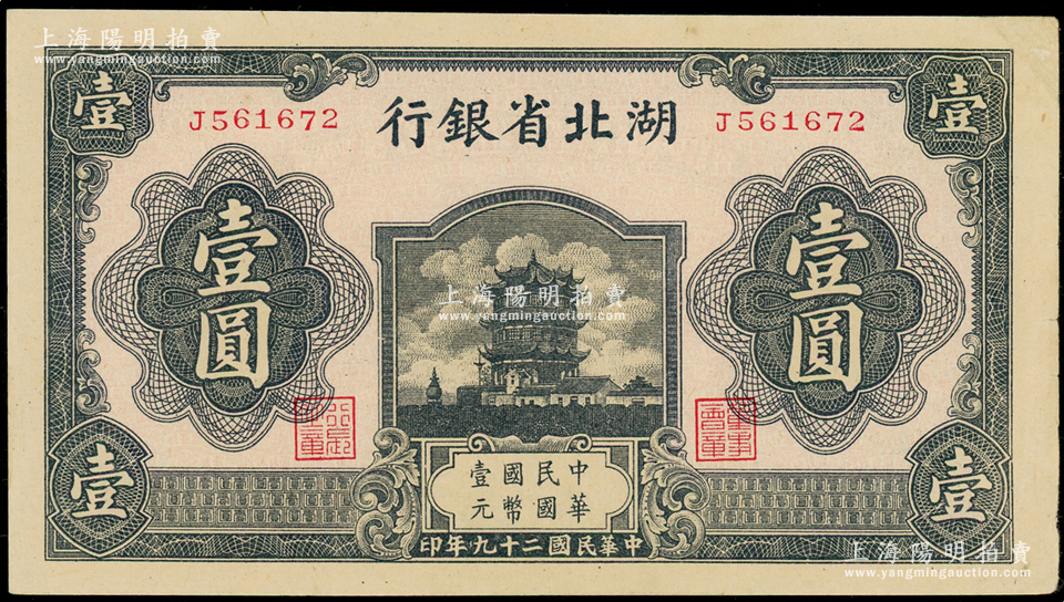 民国二十九年(1940年)湖北省银行黄鹤楼图壹圆,属少见品种,角有小修,九成新