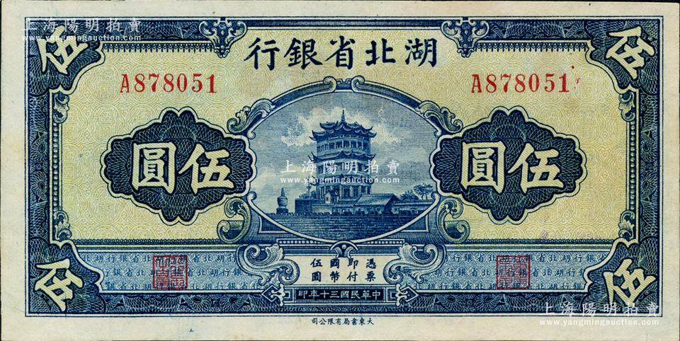民国三十年(1941年)湖北省银行黄鹤楼图伍圆,品相甚佳,九五成新