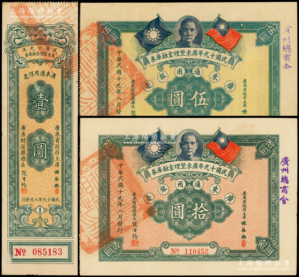 民国十九年广东整理金融库券壹圆、伍圆、拾圆共3枚不同,上有广东省政府主席陈铭枢签名,且其中2枚盖有“广州总商会”字样,少见,八至八五成新