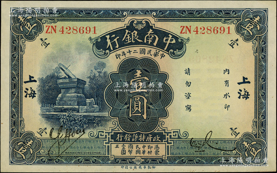 民国二十年(1931年)中南银行壹圆,“大字”上海地名;源于前辈名家之遗藏,原汁原味,全新