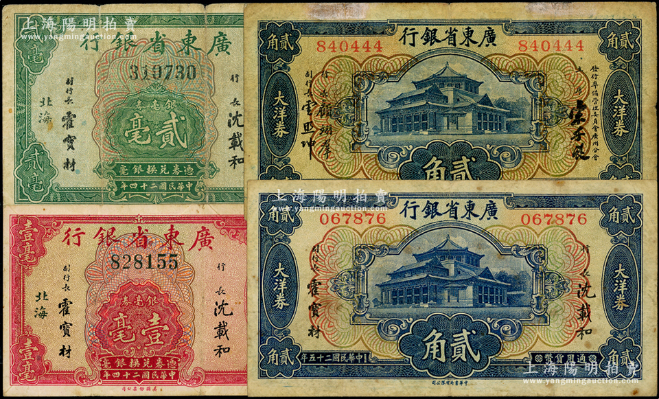 广东省银行纸币4种,详分:1935年银毫券壹毫、贰毫,均属“北海”地名券;1936年大洋券贰角2种,分别为第一版沈载和·霍宝材和第二版宋子良·顾翊群·云照坤签名券;七至七五成新