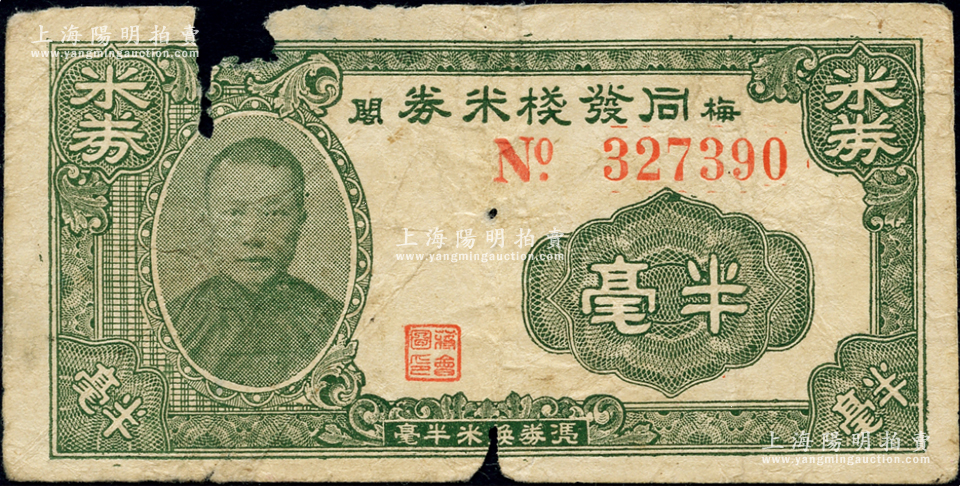 民国三拾年(1941年)同发栈米券半毫,“梅阁”地名,乃属广东新会县民间钞票,上印人像图,少见,有缺损,近六成新