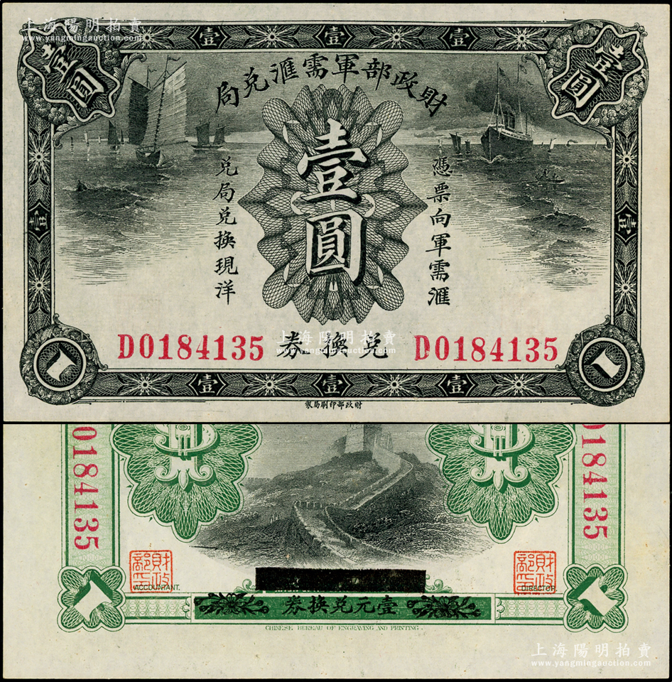 财政部军需汇兑局兑换券壹圆,护法战争时期北洋政府发行,上佳品相,九五成新