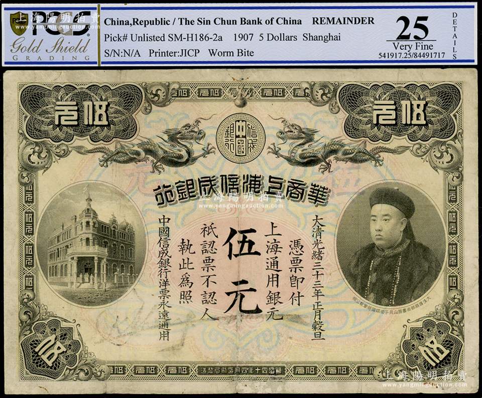 光绪三十三年(1907年)华商上海信成银行伍元,上海通用银元,上印商部尚书载振像,PCGS 25 VF,敬请预览