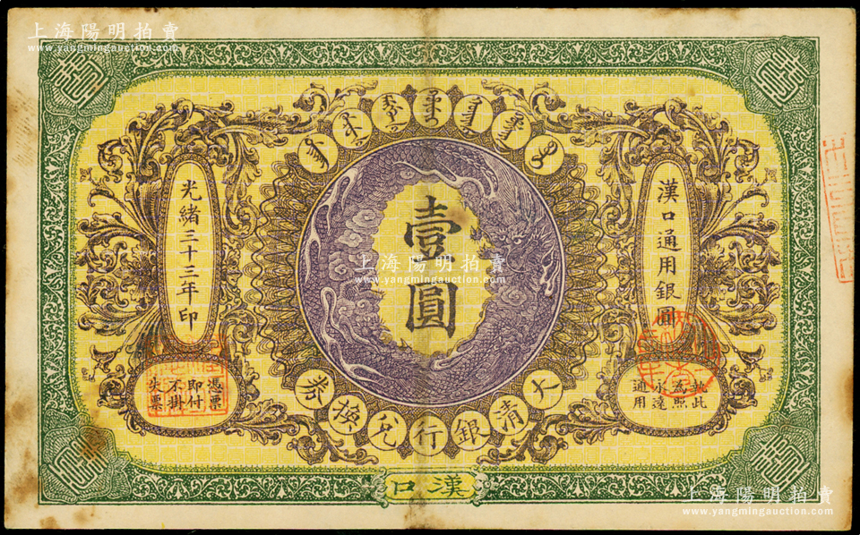 光绪三十三年(1907年)大清银行兑换券壹圆,汉口地名,5位数号码券,正面纹饰及蟠龙图为紫色;此乃流通票,背有英文签名,八成新