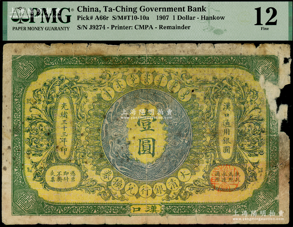 光绪三十三年(1907年)大清银行兑换券壹圆,汉口地名,4位数号码券,正面纹饰及蟠龙图为蓝灰色,有破损,PMG 12 FINE