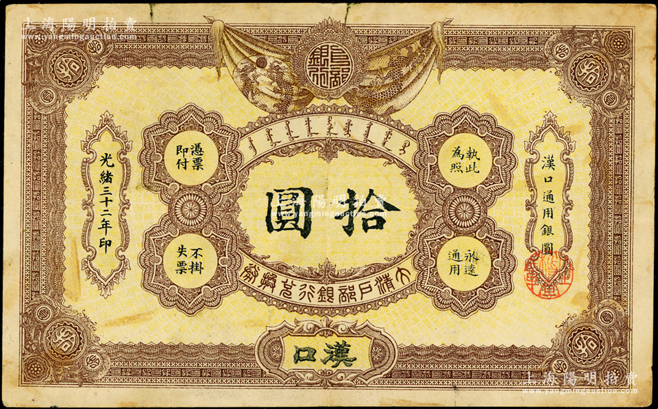 光绪三十二年(1906年)大清户部银行兑换券拾圆,汉口地名,少见,原票七五成新