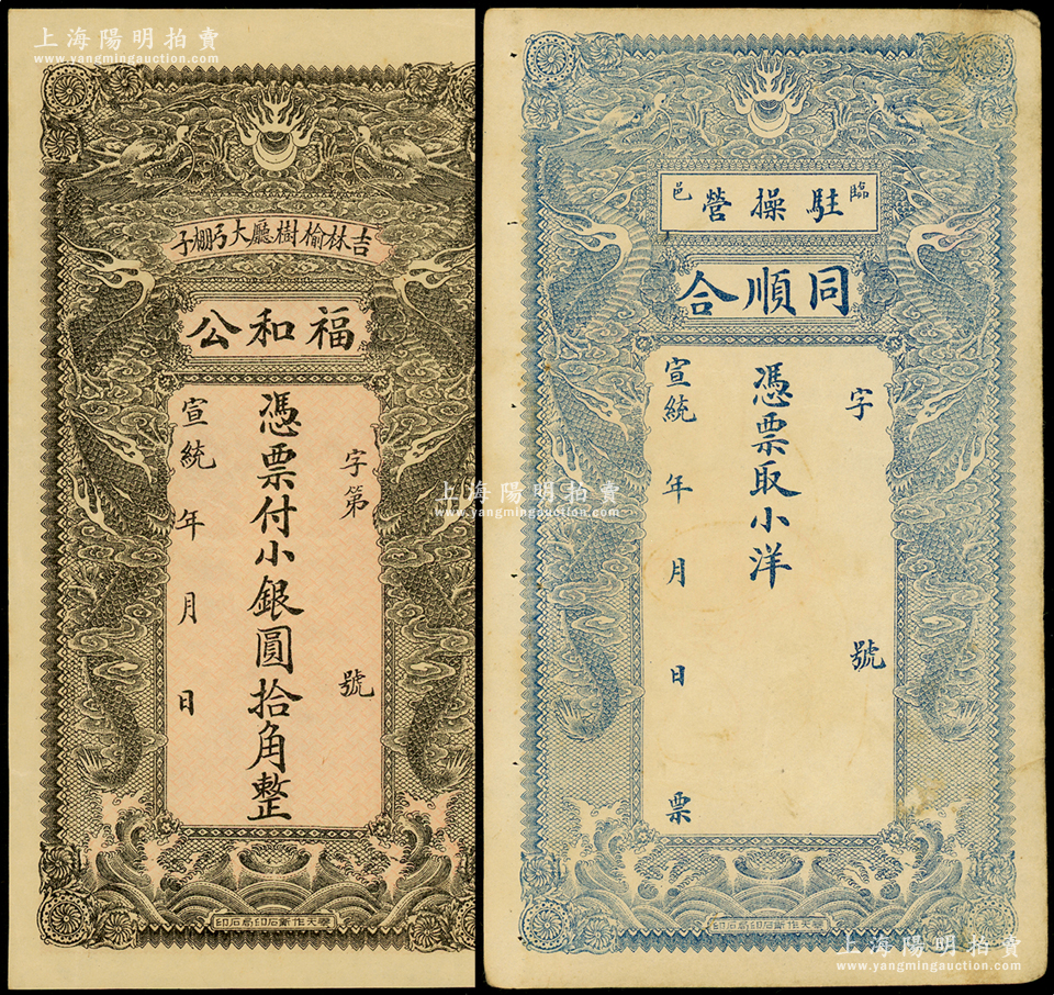 宣统年“双龙图”钱票2种,详分:(吉林榆树厅)福和公小银圆拾角,背印聚宝盆;直隶(临邑驻操营)同顺合小洋未填用;资深藏家出品,八至九五成新