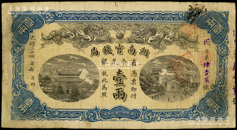 光绪三十四年(1908年)湖南官钱局省平足银壹两,匪字号;资深藏家出品,角有小修,七五成新