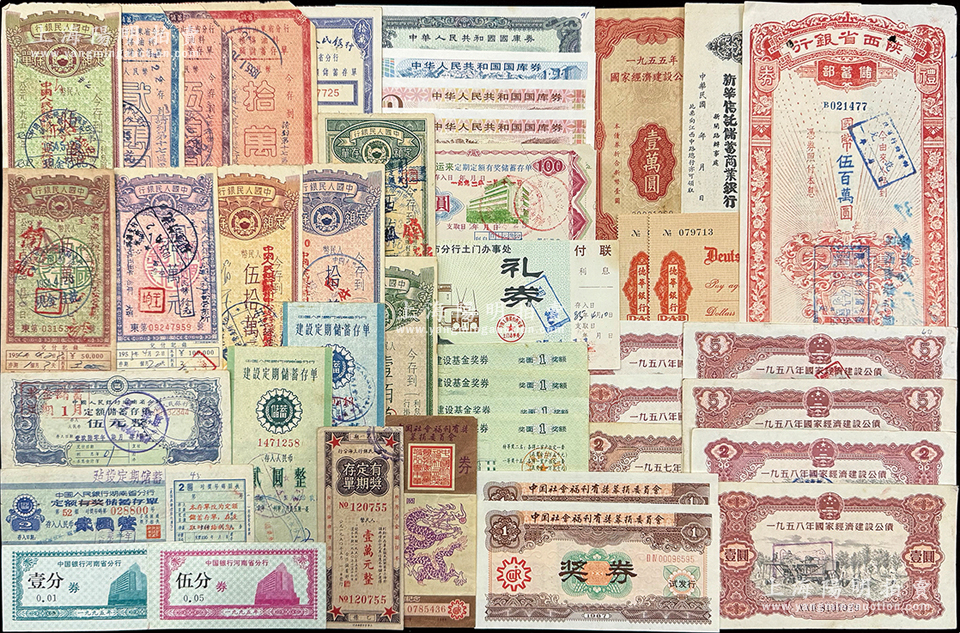 民国至新中国各类票据等一组共70余枚,内以存单为主,兼有支票、礼券、经济建设公债、国库券、奖券、代价券等,部分重复,因品种繁多,难以细述;源于前辈名家之遗藏,七成至全新,敬请预览
