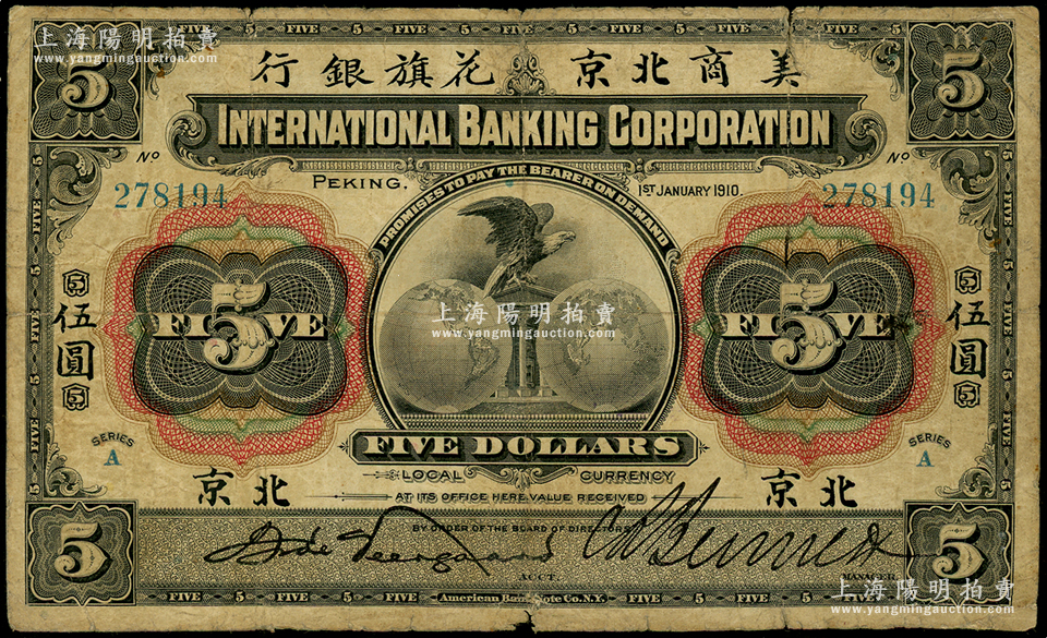 1910年美商北京花旗银行伍圆,北京地名;江南藏家出品,原票七成新