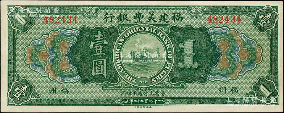 1922年福建美丰银行壹圆,福州地名,九至九五成新