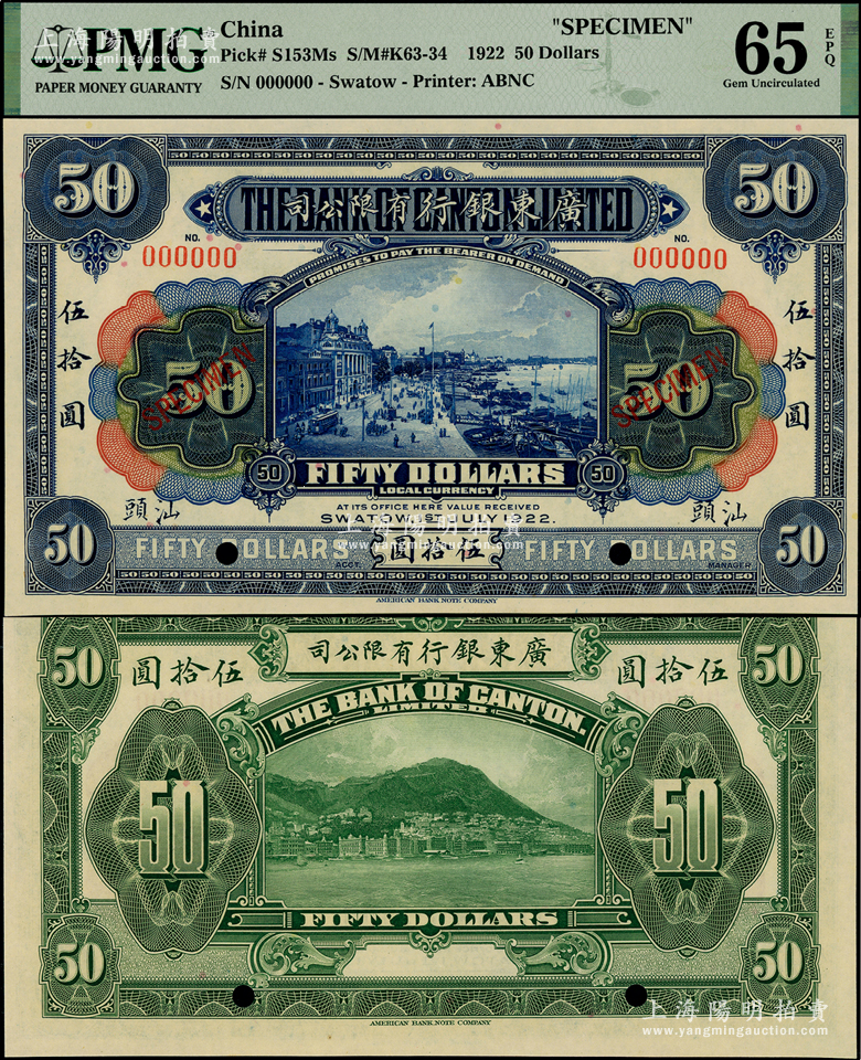 1922年广东银行有限公司伍拾圆样本券,汕头地名;岭南藏家出品,罕见且属首度公诸于阳明,全新