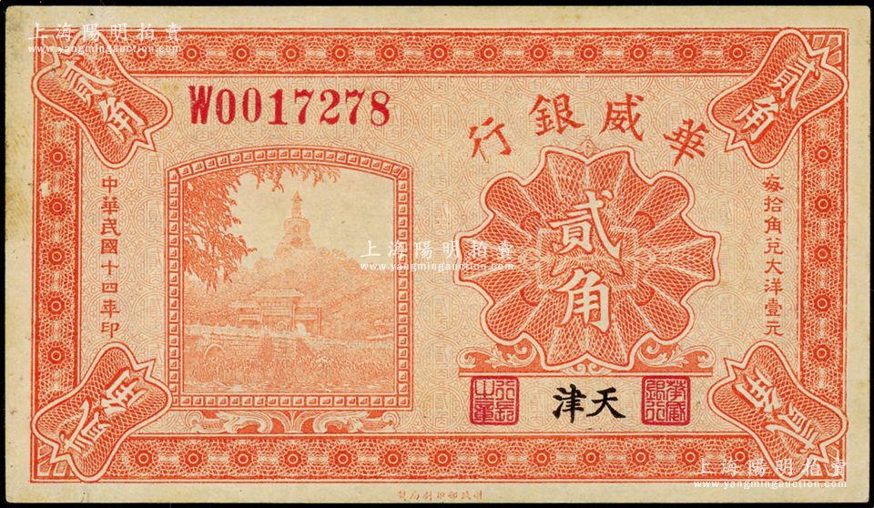 民国十四年(1925年)华威银行贰角,天津地名,未折九成新