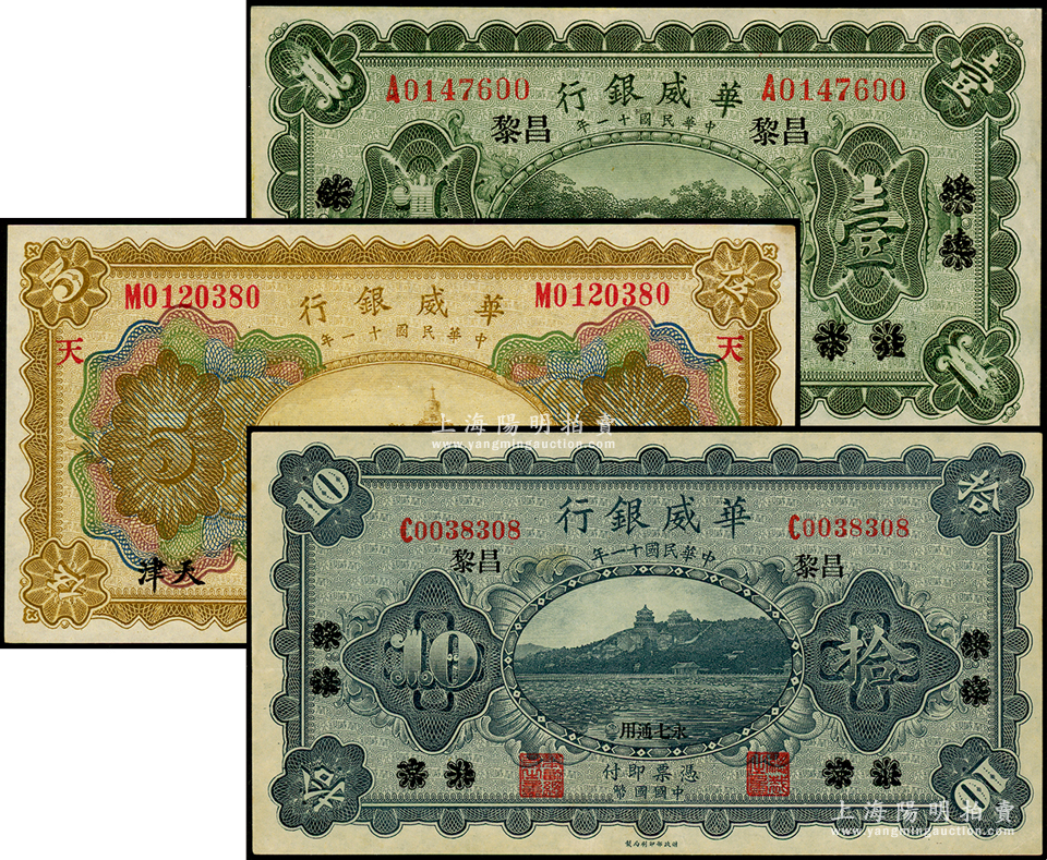 民国十一年(1922年)华威银行纸币3种,详分:单色版壹圆、拾圆,均为北京改绥远再改昌黎地名,永七通用;多色版伍圆,天津地名,加印“天”字;九五成新